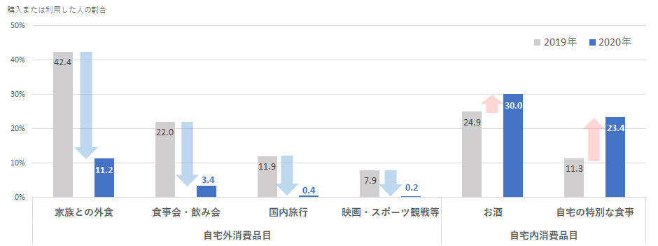 ゴールデンウィークの消費品目、前年よりも「外食」や「旅行」等の自宅外消費が大幅減、一方で、「お酒」や「自宅の特別な食事」といった自宅内消費は増加