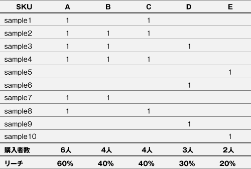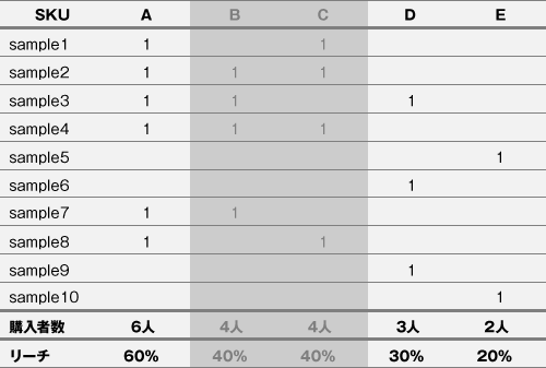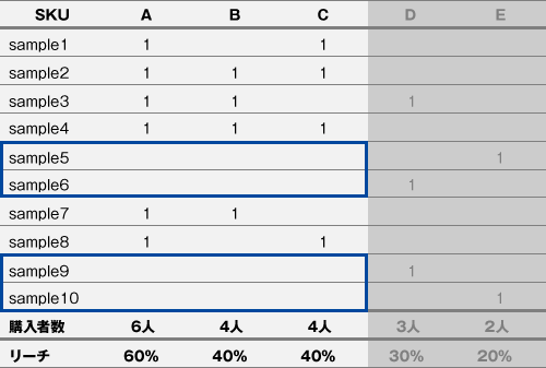 一方、極力購入者数を担保する(リーチを最大化する)という観点で考えるならBとCを削除する方が得策である。以下の図の通りDとEを残すことによってsample5、6、9、10などAでは捉えきれなかった購入者もDとEでカバーすることができ、消費者へのリーチという意味では最大化することが可能である。どちらの考え方を採用すべきかについては商品カテゴリーや自ブランドのポジションによって異なるが、単純に売れていないものから順に削減することが正しいとは限らない、ということがおわかりいただけるだろう。