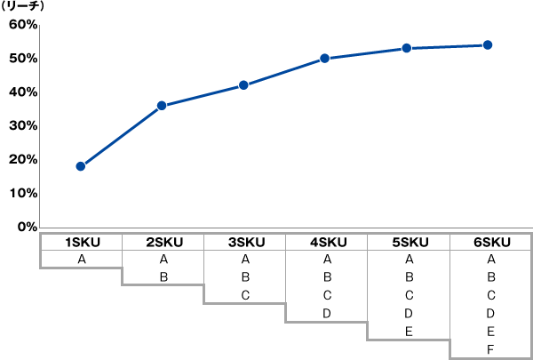 TURF Analysisでは、リーチ(上の例での購入者数)を最大化する分析も、フリクエンシー(上の例での購入個数)を最大化する分析も可能であり、上記したような実売データでの分析や上市前のバリアント検討などであればアンケートデータから分析を行うことも可能である。また、以下のようにリーチをXX%獲得するためにはいくつのSKUが必要か?などブランド立ち上げ時の中期プランにも活用できる。
