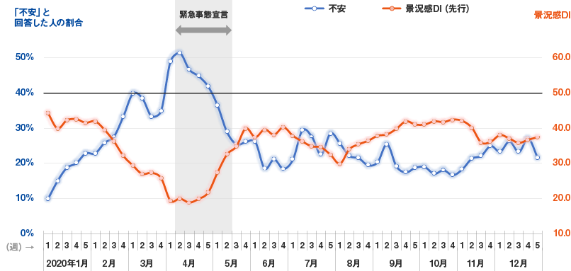 新型コロナ以前までは、ゴールデンウィークやお盆・年末年始といった消費が盛り上がるタイミングに、「ポジティブ」のスコアも高まるという傾向があった。また、「ポジティブ」のスコアを「ネガティブ」のスコアが上回るということは一度も無かった。しかし、2020年1月、中国・武漢での都市封鎖が報道されたタイミングで、初めて「ポジティブ」と「ネガティブ」が逆転、3月の小中高一斉休校の報道のタイミングで「ネガティブ」が一段上のステージへ上昇、4月の緊急事態宣言発令の直前でピークに達した。その後、緊急事態宣言の発令期間中から冷静さを取り戻し、徐々に「ネガティブ」が低下し「ポジティブ」も回復していった。