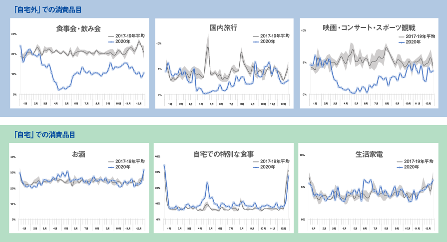 2020年の消費行動の縮小は、すべての領域、業界が一律同じ影響を受けたわけではない。MWIでは過去1週間に消費した品目についてデータを取得しているが、例年に比べて大きく需要が消滅してしまった領域とそうでない領域とがある。それは自宅外で消費することを目的とするものと、自宅で消費することを目的とするものとで大きく様相が異なる(図4)。