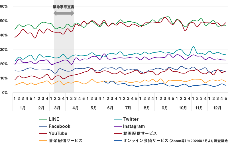 特に緊急事態宣言期間中は、ステイホームで退屈せずに過ごすために、「YouTube」や「動画配信サービス(NETFLIX・Huluなど)」などの利用率が大幅に増加した。また、テレワークによって一躍脚光を浴びた「オンライン会議サービス(Zoomなど)」を6月から調査対象項目に加えたが、開始直後が最も高く、人々の外出する機会が増えることによって「オンライン会議サービス」の利用率は緩やかに下がっていった。