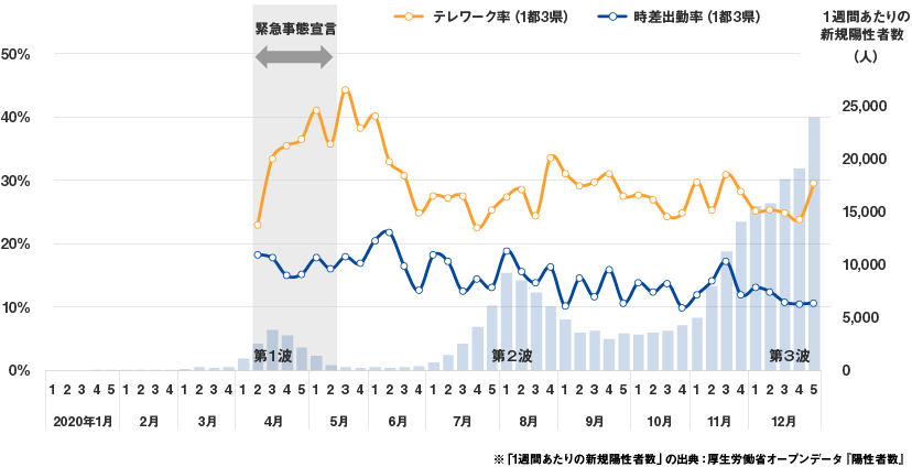 「テレワーク率」は緊急事態宣言が発令されてから徐々に高まっていき、5月下旬の解除直前には約40%台となった。緊急事態宣言解除後の「テレワーク率」は25%前後に落ち着いている。すべての業種・業態がテレワークに対応できるわけではないが、第3波の到来により新規感染者数が急増している中、テレワーク率が上昇する気配は見られていない。