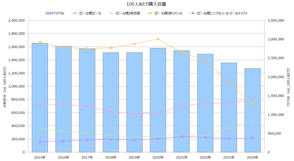 100人あたり購入金額を「購入率(購入者数)」と「購入者あたり購入金額(購入者の平均購入金額)」の要素に分けると、2015年と2024年の比較で購入率が115%、購入者あたり購入金額が162%とどちらも大きく伸長しています。