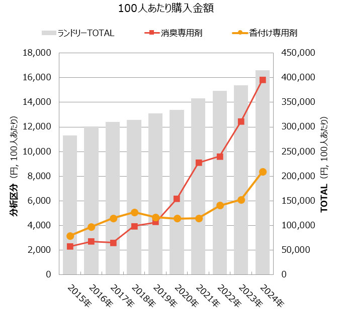 2015年以降の10年間で、「消臭専用剤」市場は着実に購買金額を拡大してきました。次のグラフを見ると、「消臭専用剤」は2015年から100人あたり金額が右肩上がりの傾向となっており、金額規模を拡大していることが分かります。