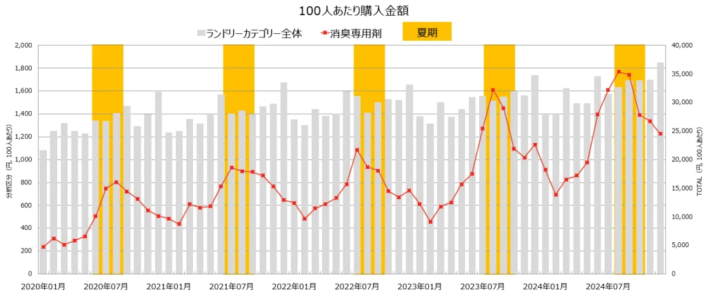 更に、季節性の傾向を見ると、例年、夏期に購買金額が伸びる傾向が見られ、気温や湿度、生活環境の変化が購買行動に影響を与えていることが示唆されます。