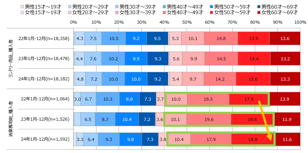 ランドリーカテゴリ全体と比較すると、「消臭専用剤」の購入者は女性比率が高く、特に30〜50代の割合が大きいことが特徴です。中でも50代女性の構成比は年々増加傾向にあります。