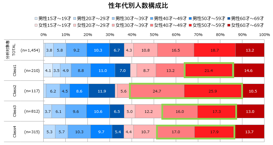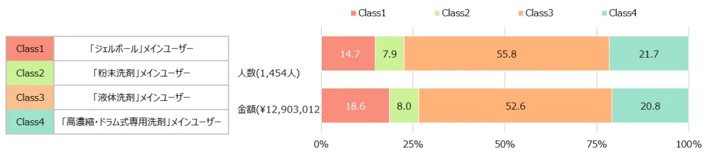 さらに購入者像を明らかにするため、2024年9月〜2025年8月の1年間の購買データを用い、「消臭専用剤」を購入、かつ、「合成洗剤・柔軟剤のいずれか剤型 *」を購入している1,454人 **を対象として「潜在クラス分析」を実施しました。その結果、以下の4つのクラスタが抽出されました。