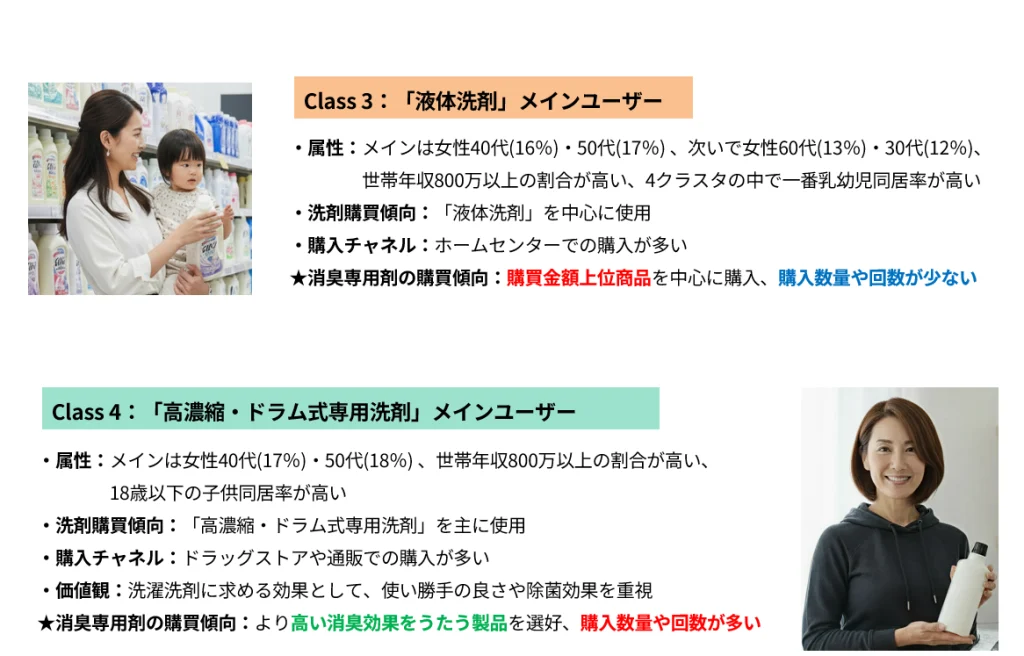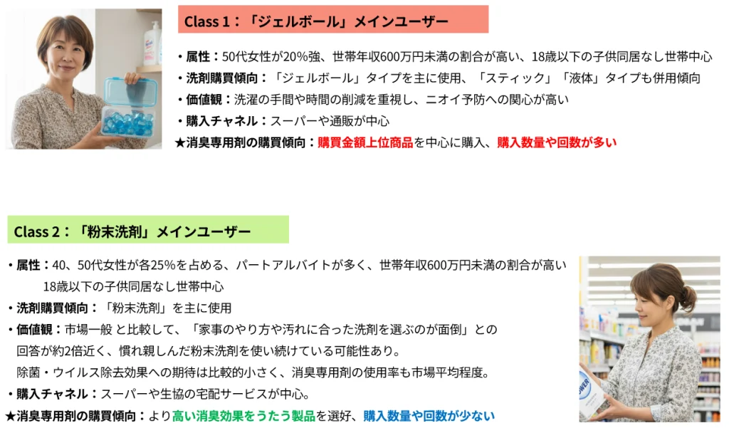 特に、潜在クラス分析を通じて、所得層や家族構成によって異なるニーズが存在することが明らかになりました。消臭剤の選択は、単なる機能性だけでなく、時短志向、衛生意識、使い勝手といった生活価値に基づいており、購入量の多いクラスタでは、洗濯用洗剤との併用によってニオイ予防や除菌効果を高めようとする意識がうかがえます。こうした“選択の構造”を把握することで、生活者の輪郭がより立体的に浮かび上がり、商品やコミュニケーションの設計においても、より的確なアプローチが可能になります。