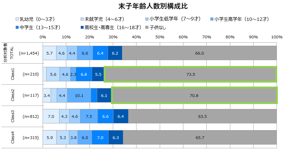 また、同居する末子の年齢別に購入者の人数構成比を確認すると、カテゴリ全体と比べて「子供なし」世帯(18歳以下の子供と同居していない世帯)の割合がやや低い点も注目されます。