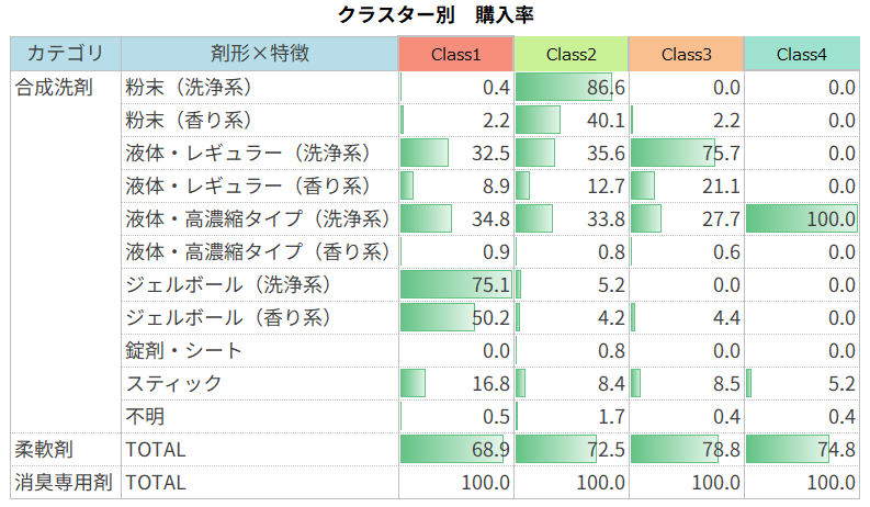 この結果から、「消臭専用剤」は一般的な合成洗剤(液体・粉末)を使用する層よりも、特徴的な剤型(ジェルボール・高濃縮洗剤)を使用する層に多く購入されていることが示唆されます。特に、購入量が多いクラスタは、ニオイ予防や除菌効果への関心が高い傾向があり、洗濯用洗剤だけでなく「消臭専用剤」を併用することで、より高い効果を求めている可能性が考えられます。