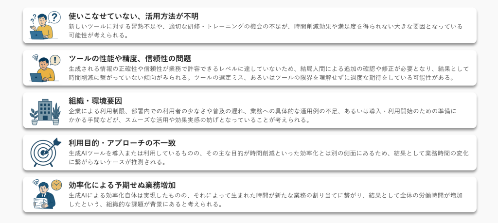 生成AIを活用しても業務時間削減につながらず、満足度が低い層も一定存在する