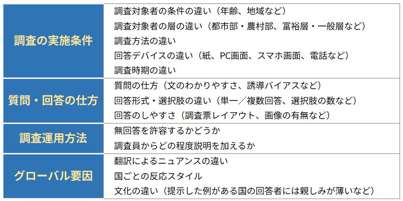 複数の調査の結果が異なる場合、一般的には【図表2】に示すように実に多くの要因が調査の結果に影響している可能性があります。