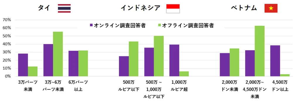 どの国も首都圏(ベトナムではハノイ首都圏と最大都市のホーチミン都市圏)での調査のため、それぞれの国の全国平均よりは収入が高めですが、特に今回はインドネシア調査とベトナム調査では、オンライン調査のほうが相対的に富裕な世帯の回答者の割合が高いといった違いがありました。