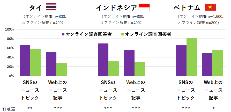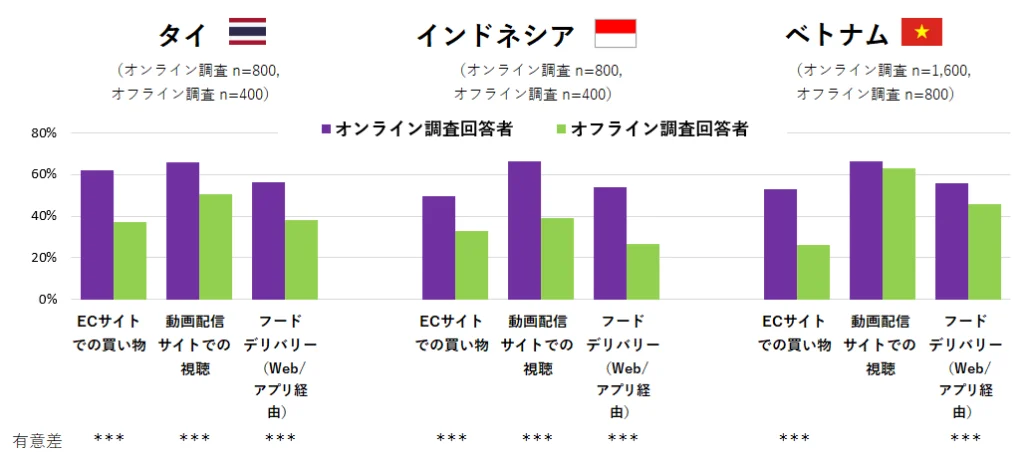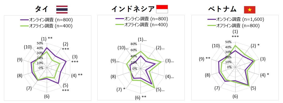 これを見ると、タイではオンライン調査回答者のほうが、インドネシアではオフライン回答者のほうが、それぞれ割合が高い傾向です。一方、ベトナムでは比較的差が小さいように見えます。