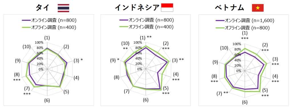 この結果も、オンライン・オフライン調査で評価の絶対水準は特にインドネシアやベトナムでは一定の差が見られましたが、各項目どうしの関係(チャートの波形)はいずれの国・調査方法でも同様でした。