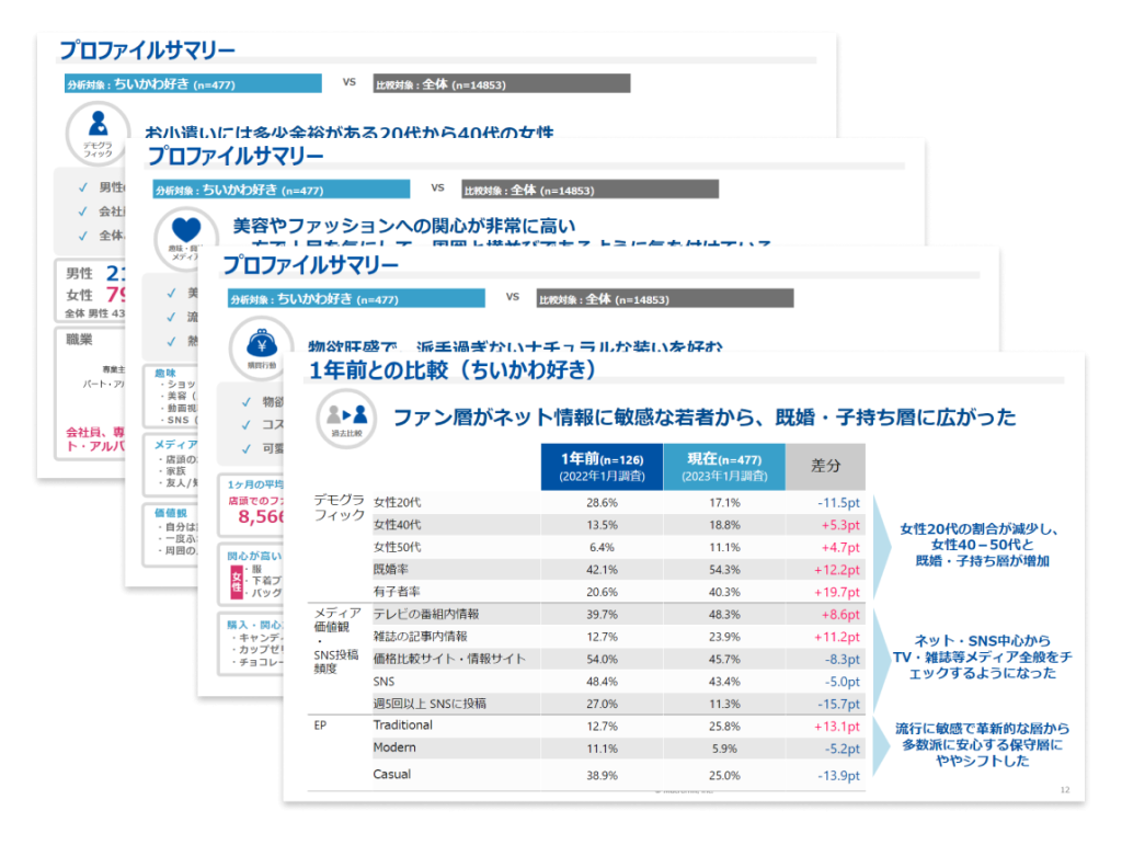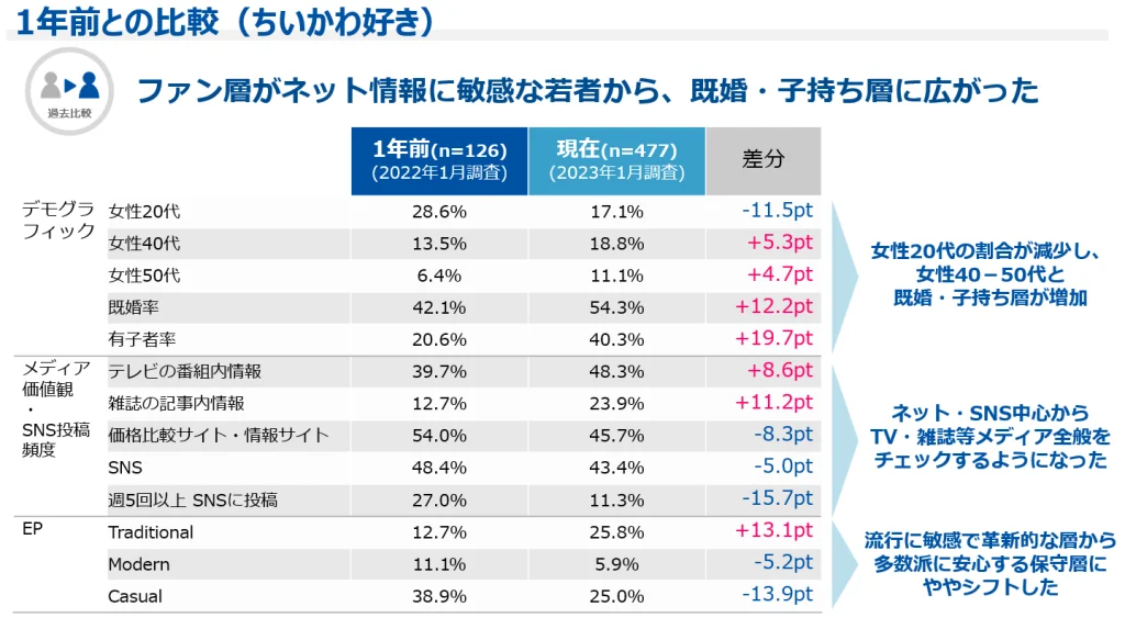 1年前の調査と比較すると、ちいかわ好きは20代女性の若年層の割合が減少し、「既婚・子持ち層」へのシフトが鮮明になりました。ちいかわブームが一般層・ファミリー層へ拡大したことが確認できます。
