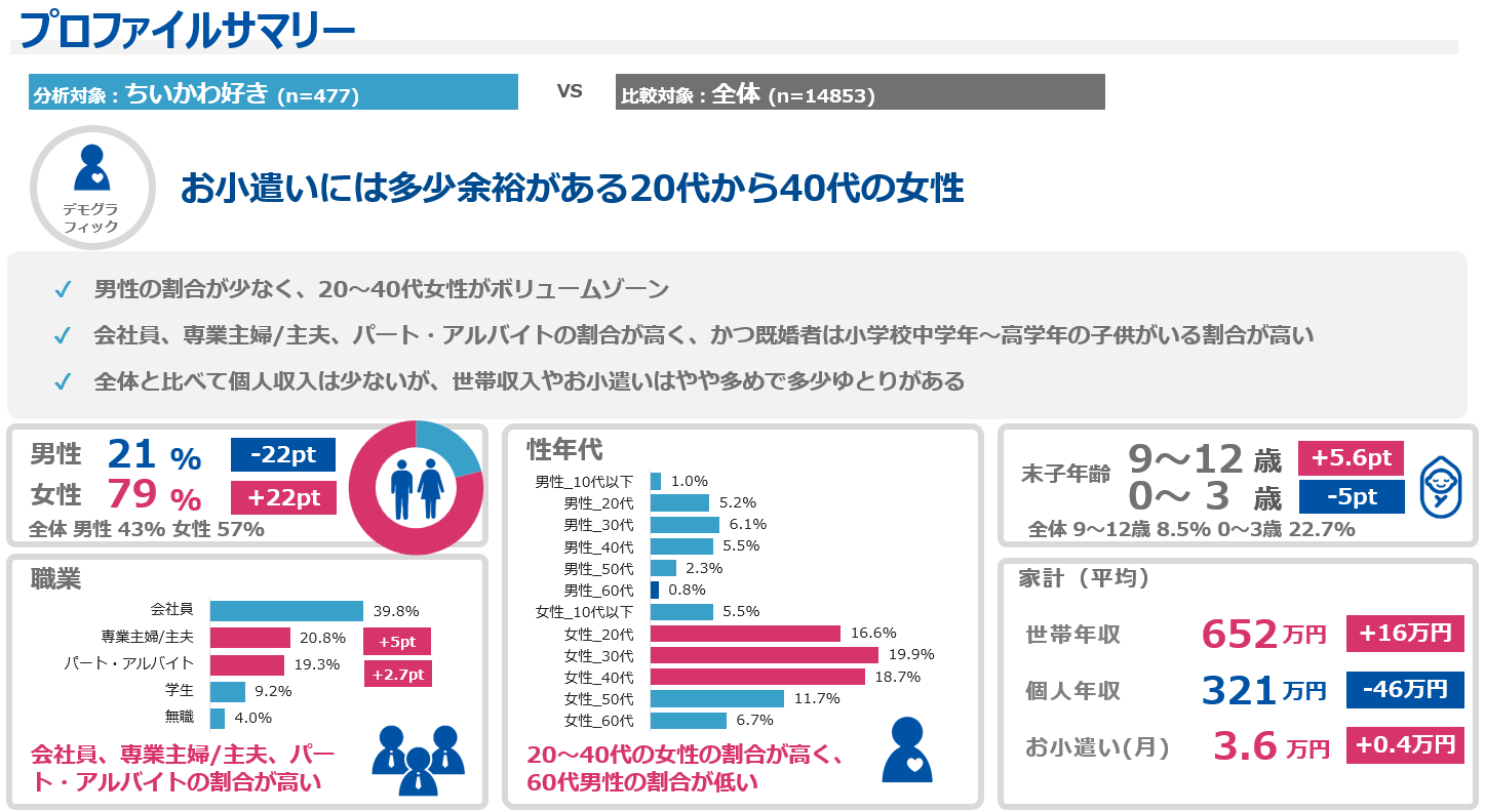 ちいかわ好きは20~40代女性がボリュームゾーンで、職業は会社員がもっとも多く40%程度。既婚者は、小学校中・高学年の子持ちの割合が高い傾向にあります。全体と比べて世帯年収や可処分所得がやや高めです。
