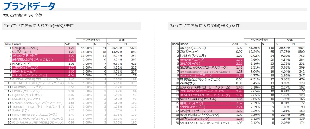 また、全体と比べてちいかわ好きは、男性が「H & M」「無印良品」「adidas」、女性は「LEPSIM」「組曲」などとの親和性が高い傾向があります。
