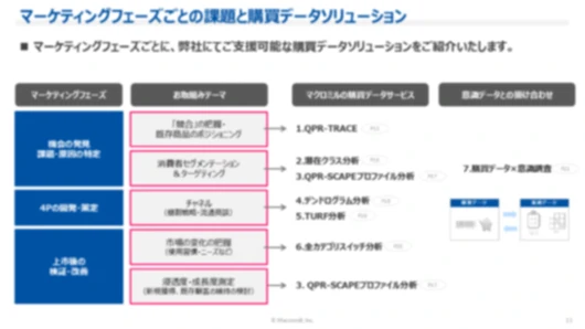 そういったマーケティング活動の各フェーズにおける、実際にご支援可能な購買データ活用法を例示しています。