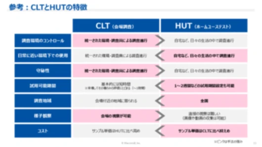 主な手法として、会場調査とホームユーステストについて、調査対象、聴取項目、分析視点などをまとめています。