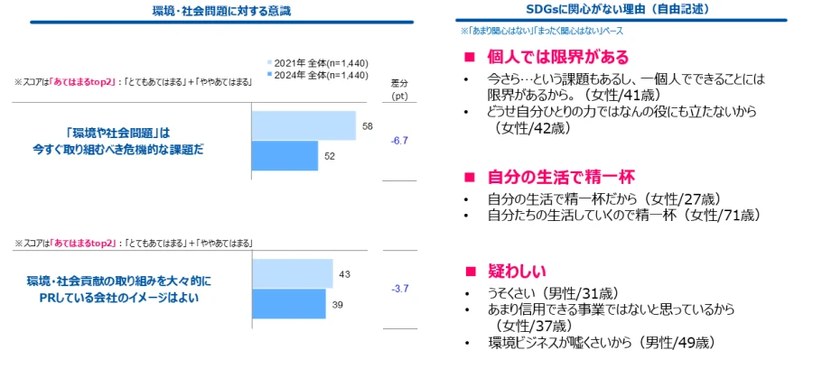 「環境や社会問題への危機意識」「環境・社会貢献を大々的にPRしている会社のイメージはよい」の項目は、全体のスコアが2021年から低下傾向。また、SDGsに関心がない理由(自由記述)を見ると、SDGsは「個人では限界がある」「自分の生活で精一杯」 「疑わしい」という意見が見受けられました。
