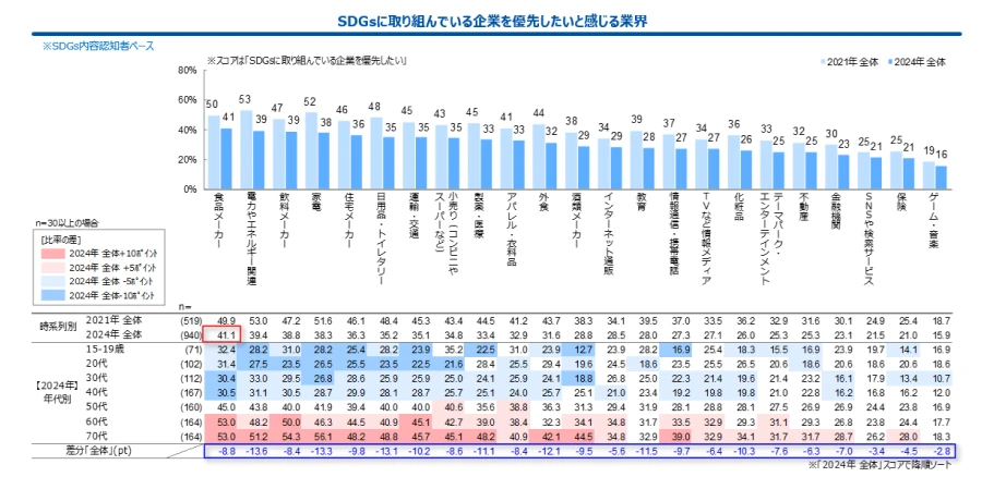 「SDGsに取り組む企業を優先したい」と感じる業界は、全体的に2021年より低下傾向にあるものの、2024年は「食品メーカー」が最も高い結果となりました。特に60代・70代で評価が高い点が特徴です。