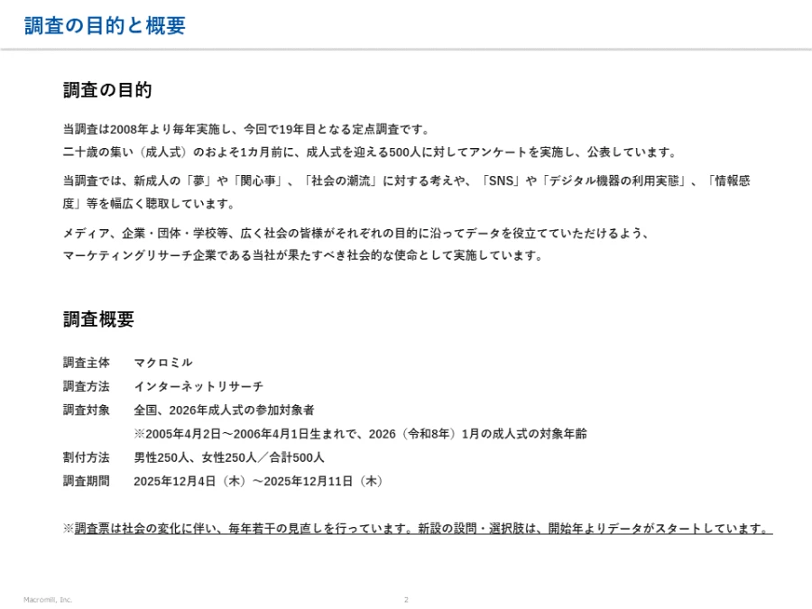 本調査は、新成人の関心ごとや価値観、各種デジタルサービスの利用実態などを明らかにするもので、今回で19回目の定点調査です。