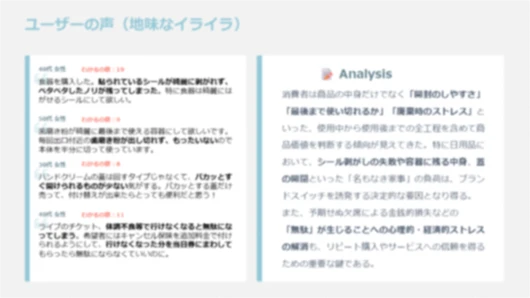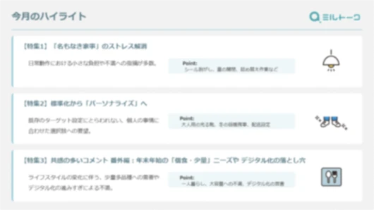 属性によるターゲット設定だけでは見えてこない、生活者のリアルな「本音」。「ミルトーク」なら、こうした定性的な気づきをスピーディに集めることが可能です。