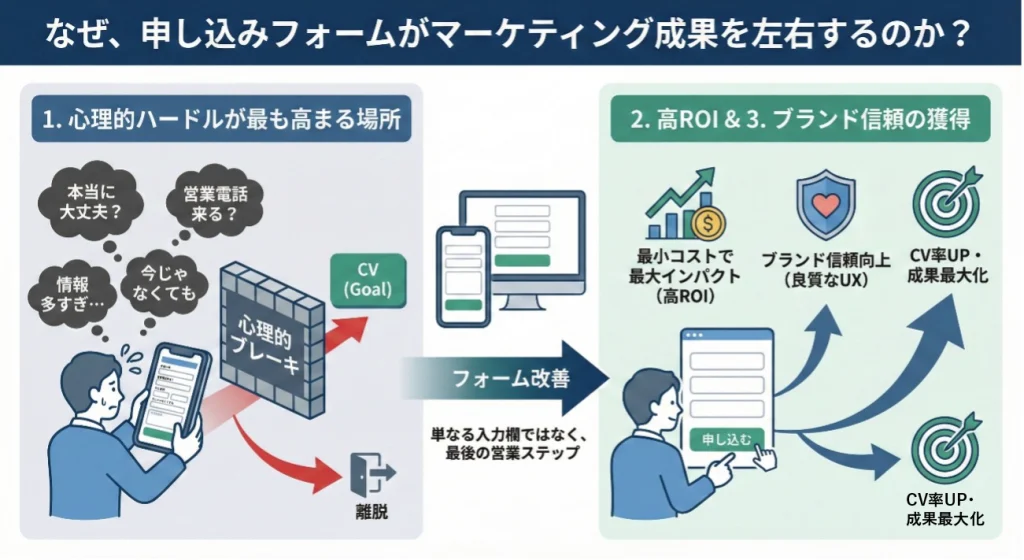 申し込みフォームは、単なる「情報の入力欄」ではなく、マーケティングの成果を決定づける最終接点です。