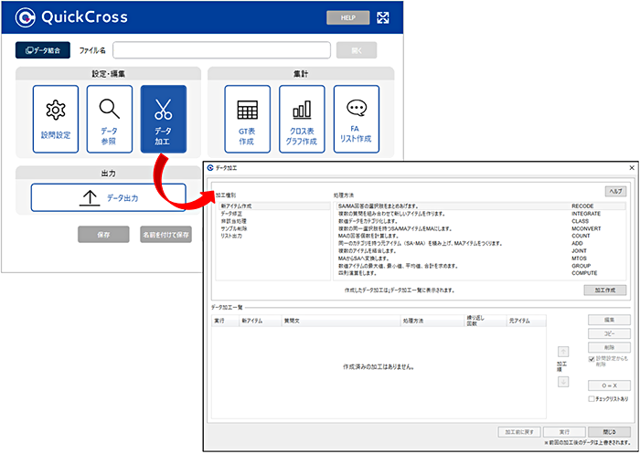 画面下の[データ加工一覧]に、作成した加工の指示が表示されているのを確認し、 右下の[実行]ボタンを押して指示を実行させます。