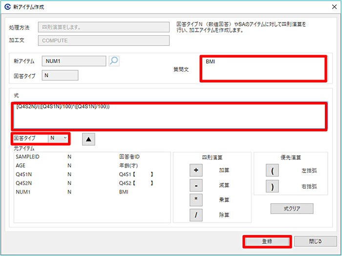 数値回答で聴取した「身長」と「体重」という2つのアイテムを使って「BMI」という新しいアイテムを作成してみましょう。