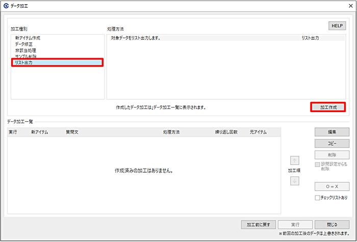 [加工種別]欄で一番下の「リスト出力」を選択し、[加工作成]を押します。