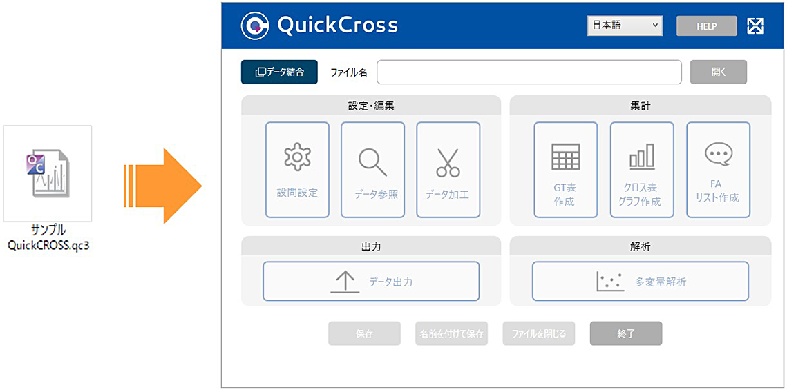 デスクトップ上にあるQuickCrossのアイコンをダブルクリックで開き、ソフトを立ち上げます。QuickCrossメニュー画面のファイル名の右側にある「開く」をクリックし、開きたい「.qc3」形式データを選択します。